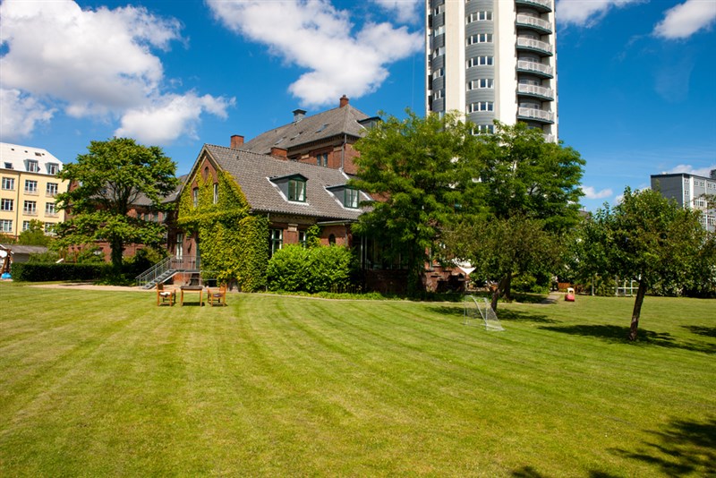 Vores dejlige have har fælles udekøkken, grillpladser, legeplads, frugttræer og hyggelige kroge.